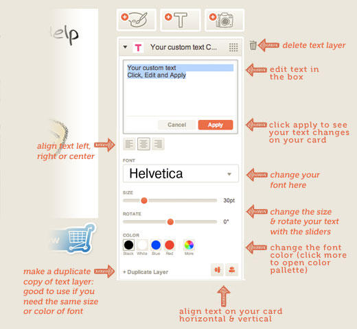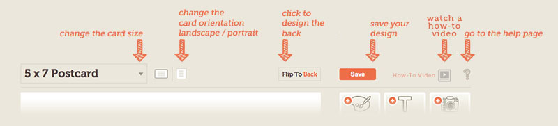To add art, text or photos to the blank card click the buttons to the right of the card at the top of the layer menu.